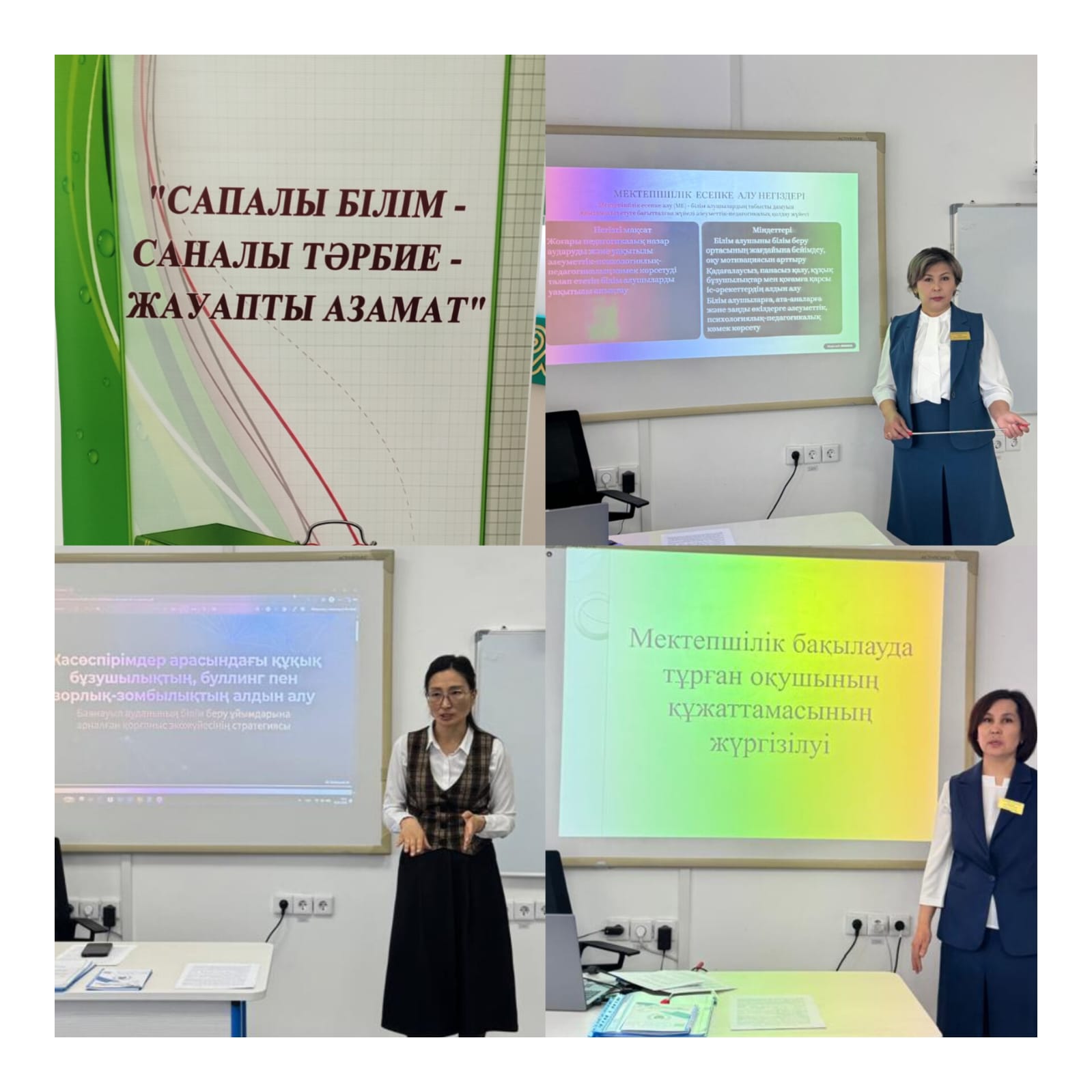 Сонымен қатар, әлеуметтік педагог А.С. Зайырова мектепішілік есепке алу құжаттамасының жүргізілу барысы бойынша таныстырылым жасап, есепке алу жұмыстарының тәртібі, құжаттарды жүйелі жүргізудің маңыздылығы және оқушылармен атқарылатын әлеуметтік-педагогикалық жұмыстар жөнінде тәжірибесімен бөлісті.Екінші кезеңде Г.А.Ахаева, А.С.Зайырова, А.М. Нухина тәжірибелік жұмыстар өткізді.